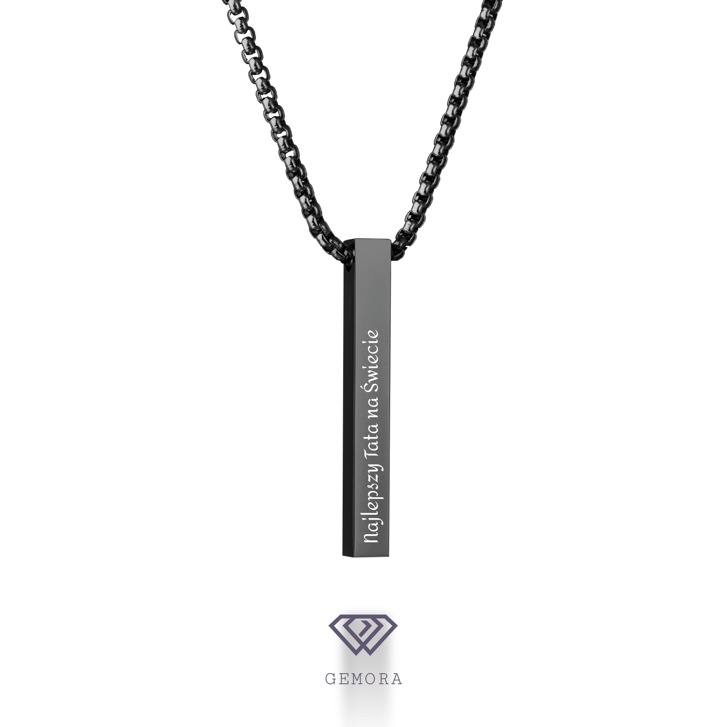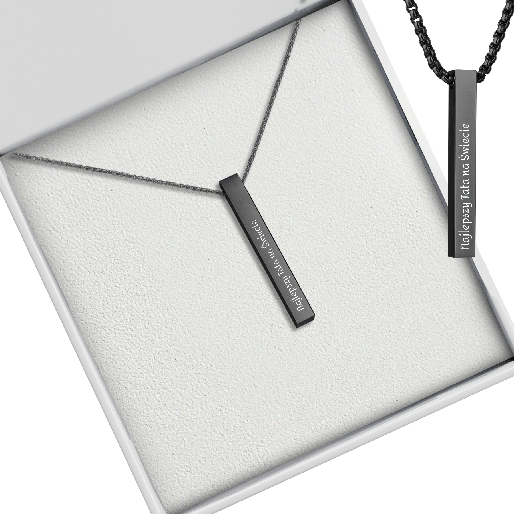 Geometryczna zawieszka typu bar/pręt 3D ze stali tytanowej to nowoczesna męska biżuteria personalizowana. Wykonujemy czterostronny grawer - imiona, inicjały, daty, współrzędne lub krótki cytat – tworząc trwały prezent z dedykacją. Model hipoalergiczny (bez niklu), odporny na ścieranie, dostępny w kolorze czarnym i srebrnym. Uniwersalny dodatek na co dzień i na okazje: Dzień Ojca, urodziny, rocznicę czy Święta.