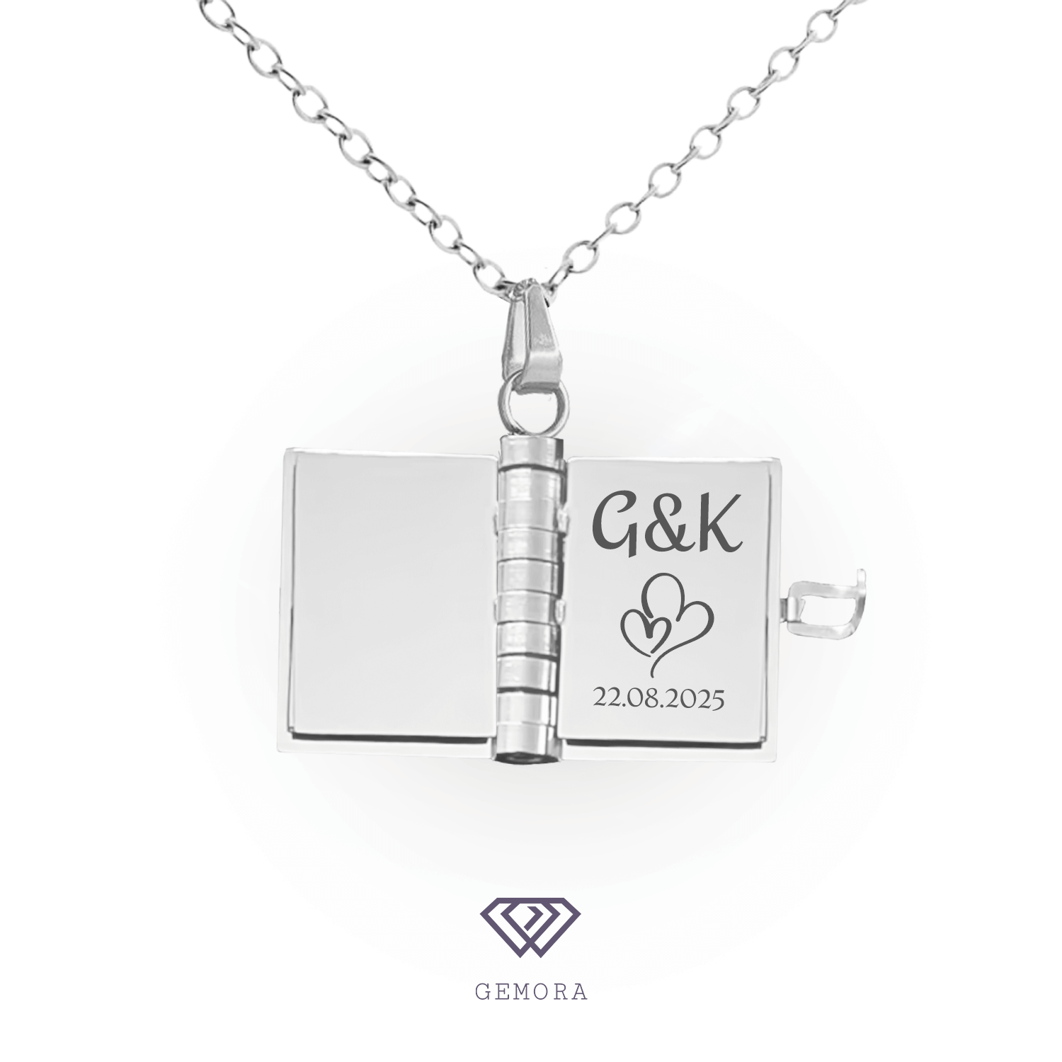 Razem: 10 pól graweru, dzięki którym otwierany naszyjnik „Książka” staje się jedyną w swoim rodzaju pamiątką – od inicjałów i ważnych dat, po krótkie wiadomości i symbole.