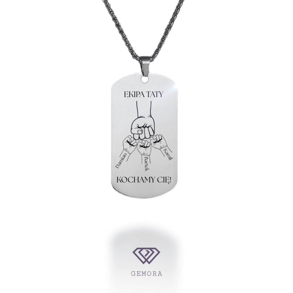 Klasyczny nieśmiertelnik z grawerem wykonany ze stali tytanowej to mocna i ponadczasowa biżuteria męska z personalizacją. Projekt „Ekipa Taty” prezentuje większą pięść taty oraz mniejsze pięści dzieci – przy każdej wygrawerujemy imię. Możesz dowolnie zmienić tytuł (np. „Ekipa Dziadka”, „Najlepszy Wujek”), dopisać własne zakończenie (np. „Kochamy Cię!”) i wybrać liczbę imion – 2, 3, 4 i więcej; dopasujemy układ, aby całość była czytelna i estetyczna. Na życzenie dodamy datę, lub krótki cytat, dzięki czemu powstanie w 100% spersonalizowany prezent z grawerem.