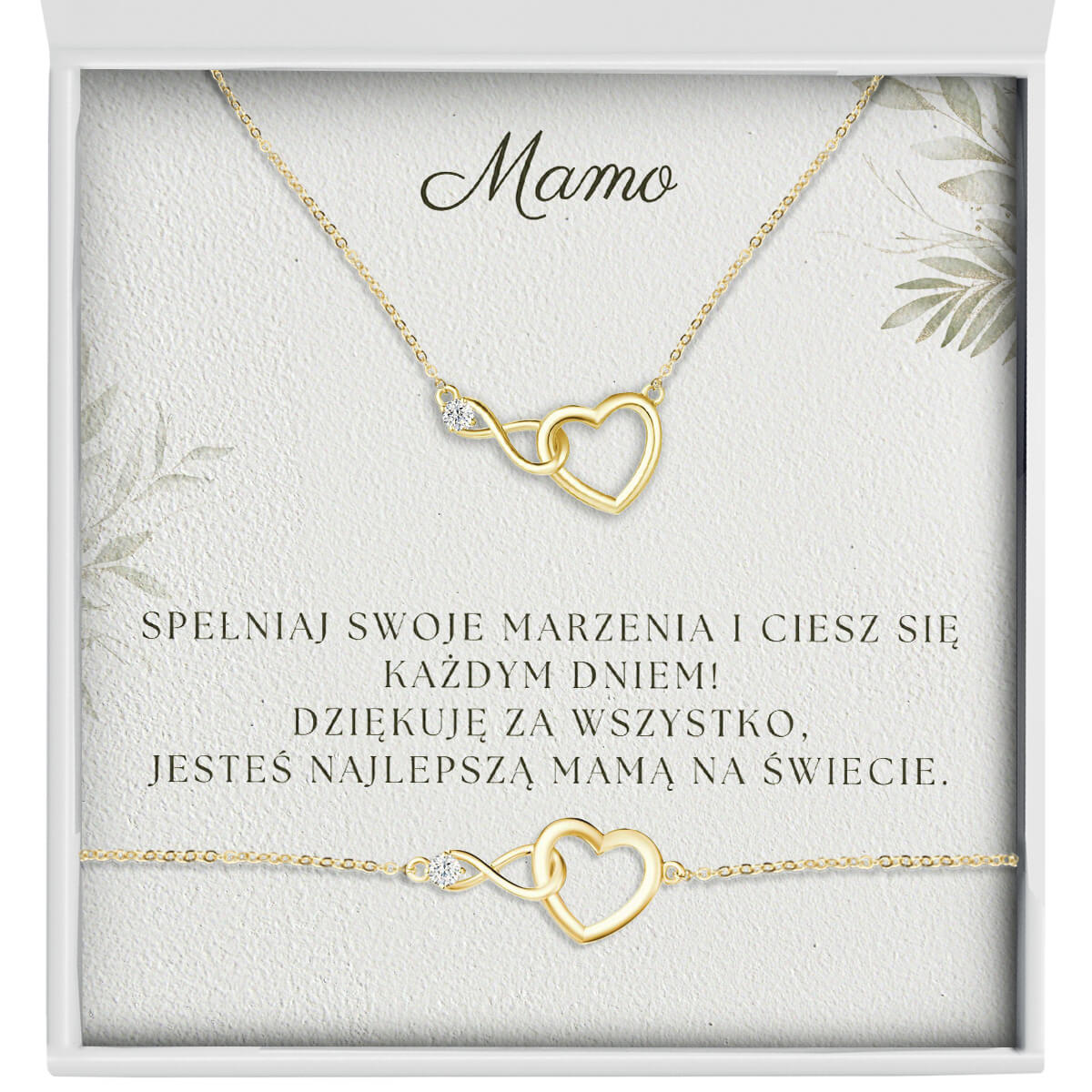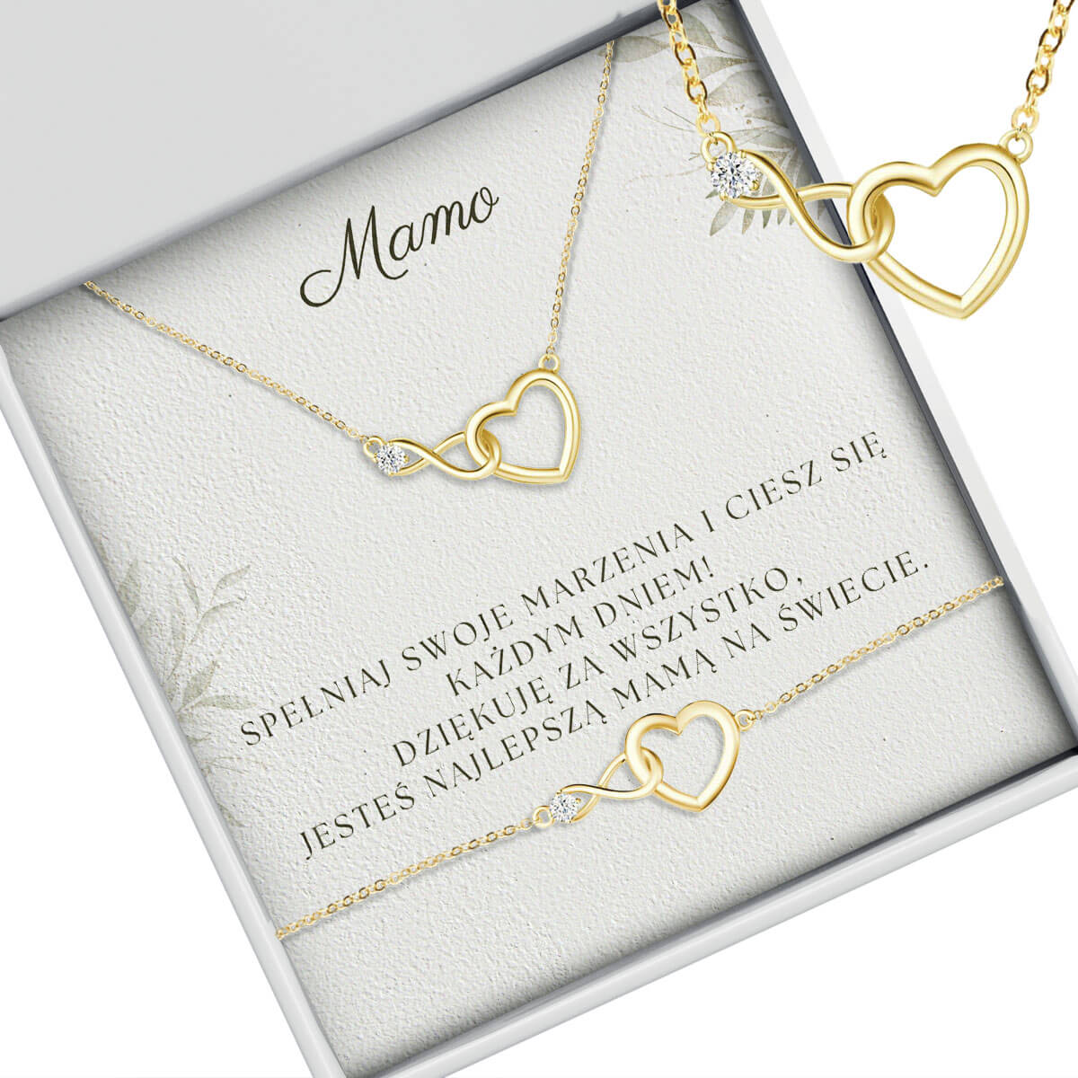 Naszyjnik i bransoletka z motywem serca splecionego z symbolem nieskończoności wyrażają to, co najważniejsze: więź, która nigdy nie słabnie i uczucie, które nie zna granic.